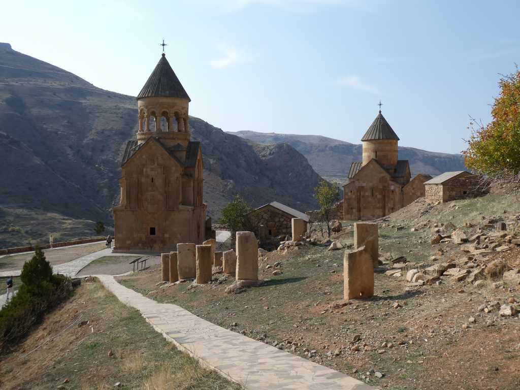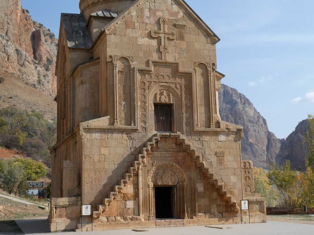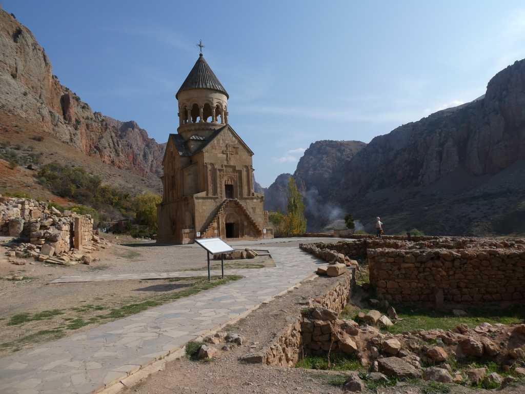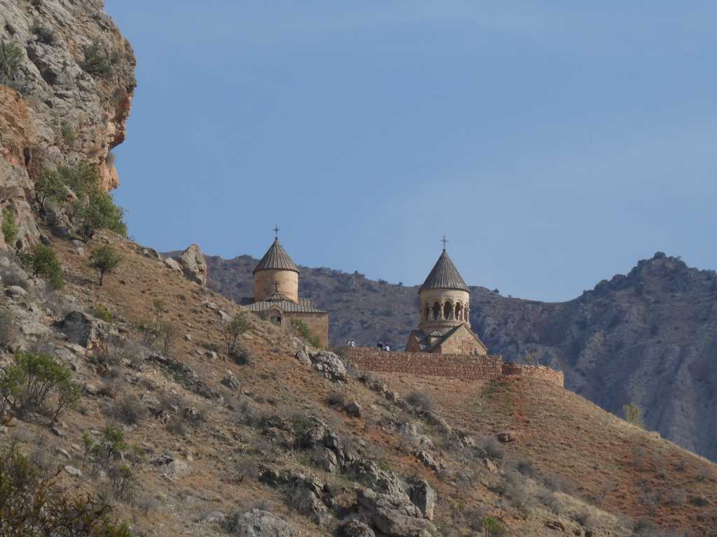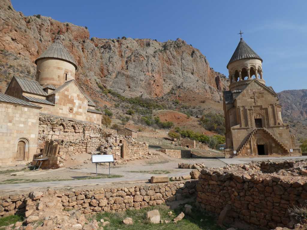 Durch eine enge Schlucht geht die Straße in ein Seitental zum Kloster Noravankh. Dort passen sich die Klostergebäude sehr harmonisch in die Landschaft ein und verschmelzen geradezu mit den Felsen im Hintergrund.