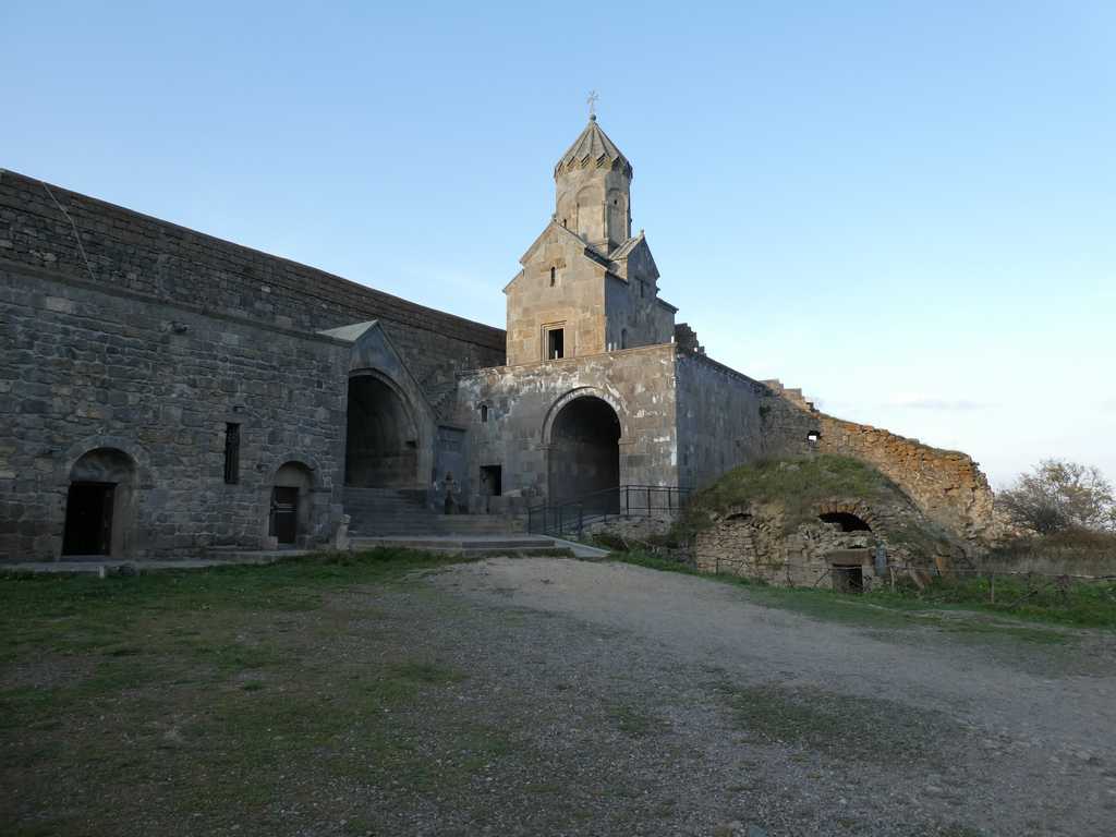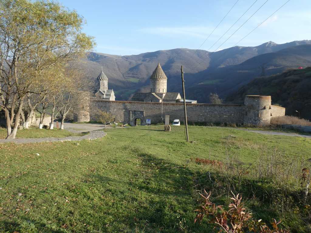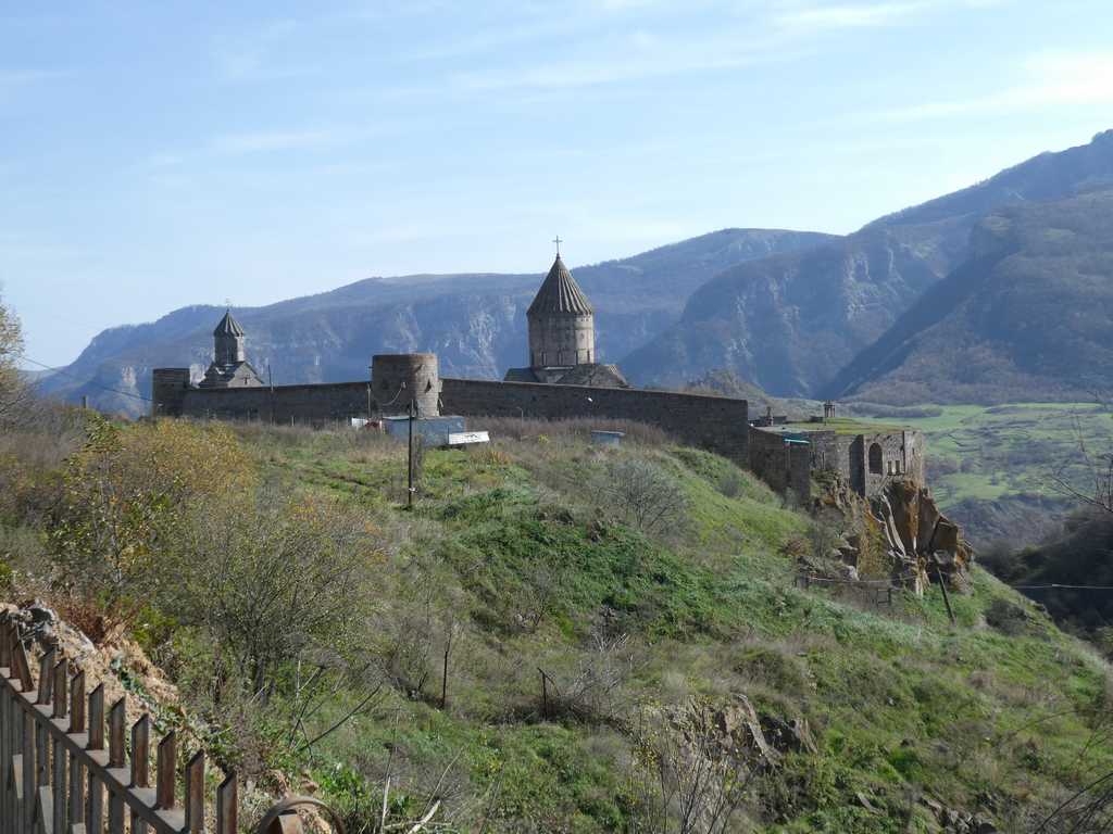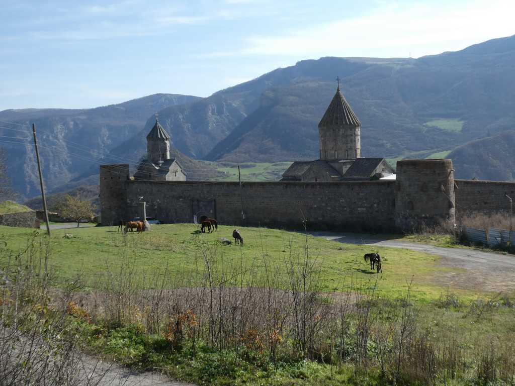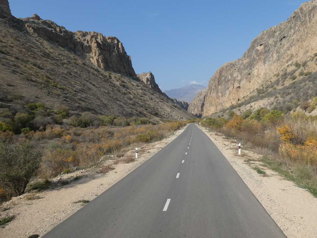 Eine abenteuerliche Schlucht führt durch das Tal des Vorotan zum Kloster Tatev. Die Kurven sind so eng, dass die großen Sattelschlepper kaum umlenken können. Oft ist der Asphalt auch stark beschädigt, so dass sich streckenweise nur Schotter mit riesigen Absätzen ergeben. An den Schleifspuren auf der Straße sieht man: Andere Fahrzeuge haben hier aufgesetzt. Wir fahren die ca. 30 km in etwa 2 Stunden. Oft kann man problemlos neben uns her laufen, so langsam sind wir unterwegs.