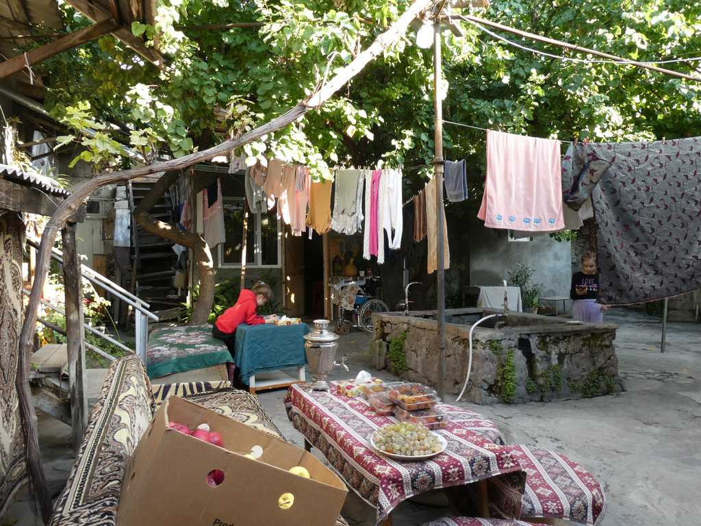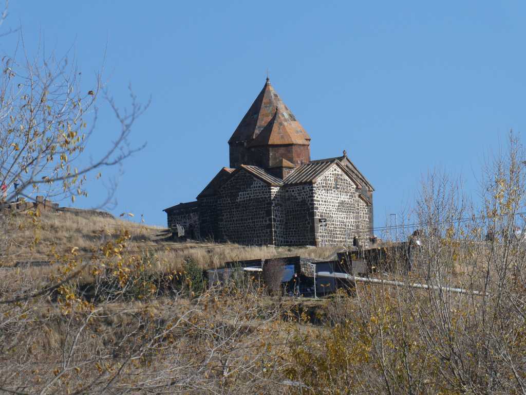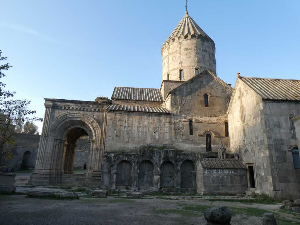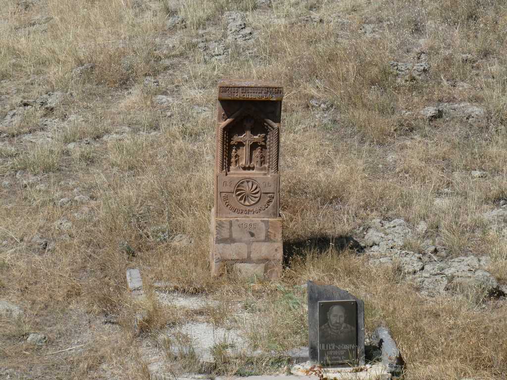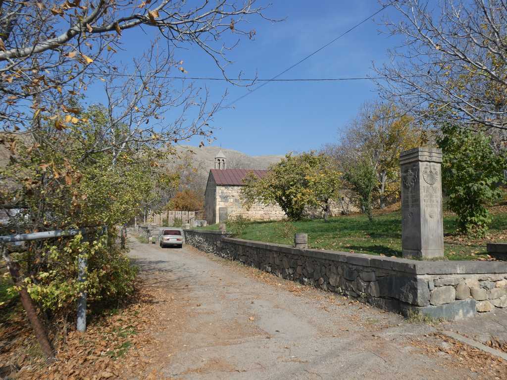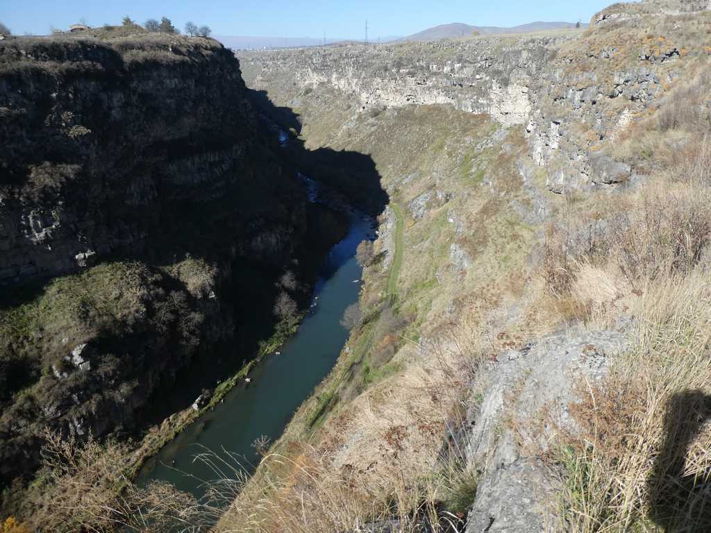 Eine abenteuerliche Schlucht führt durch das Tal des Vorotan zum Kloster Tatev. Die Kurven sind so eng, dass die großen Sattelschlepper kaum umlenken können. Oft ist der Asphalt auch stark beschädigt, so dass sich streckenweise nur Schotter mit riesigen Absätzen ergeben. An den Schleifspuren auf der Straße sieht man: Andere Fahrzeuge haben hier aufgesetzt. Wir fahren die ca. 30 km in etwa 2 Stunden. Oft kann man problemlos neben uns her laufen, so langsam sind wir unterwegs.