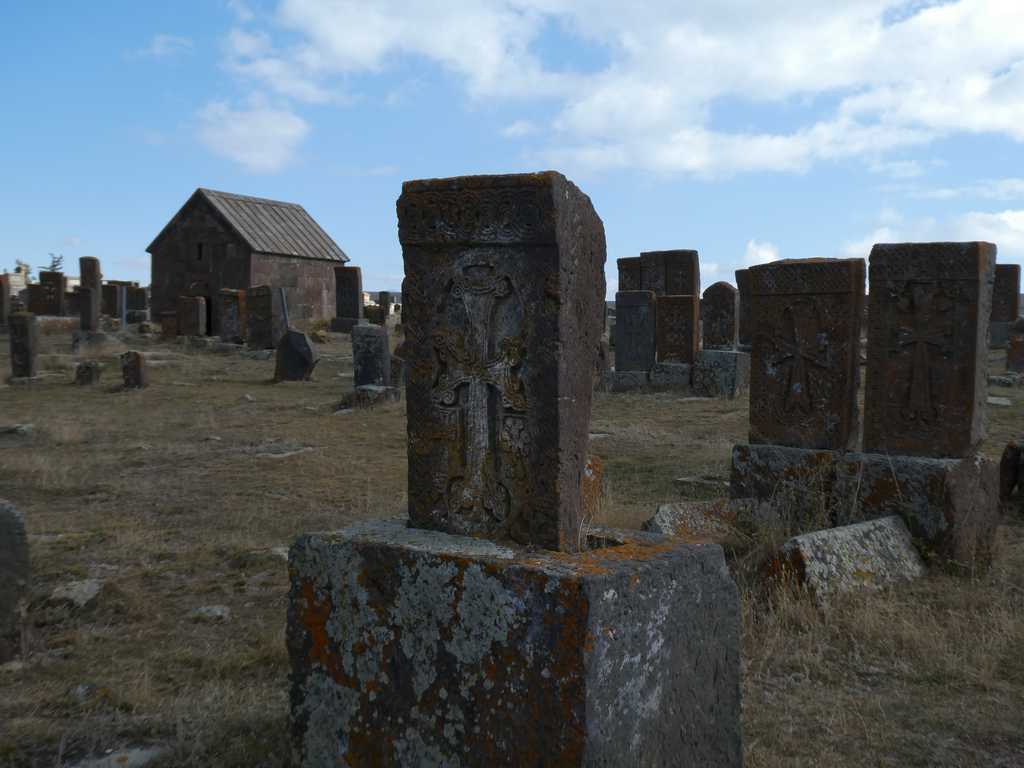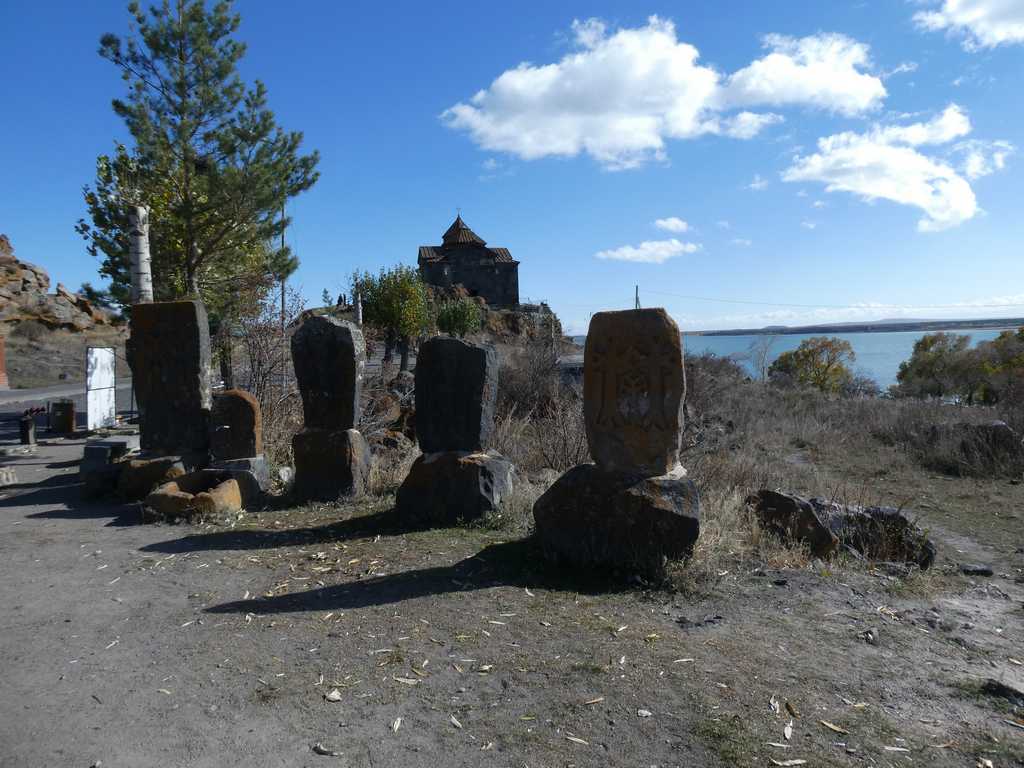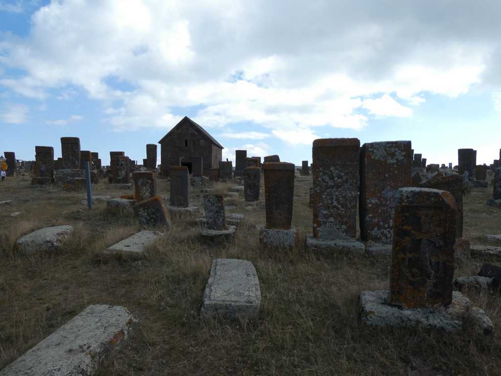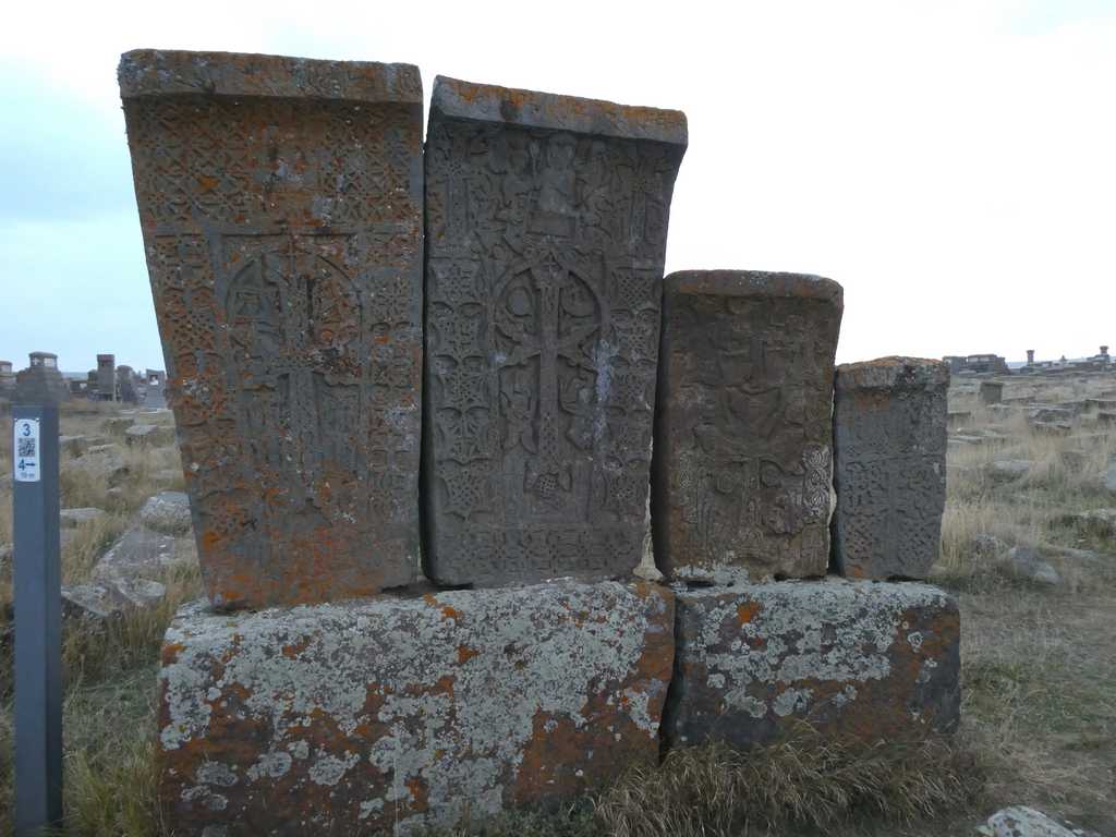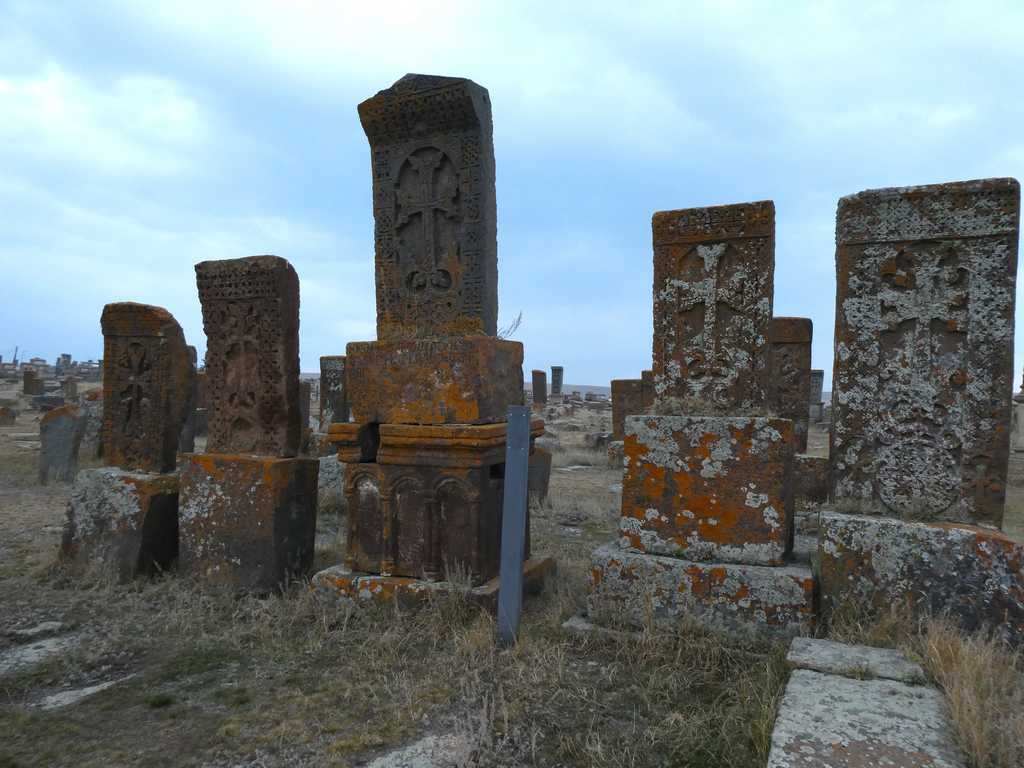 Auf einer riesigen Fläche sind hunderte alter Grabsteine, die sogenannten Kreuzsteine zu besichtigen. Manchmal stehen bis zu 13 Steine in einer Reihe. Wie uns erzählt wird, ist das eine gesamte Familie.