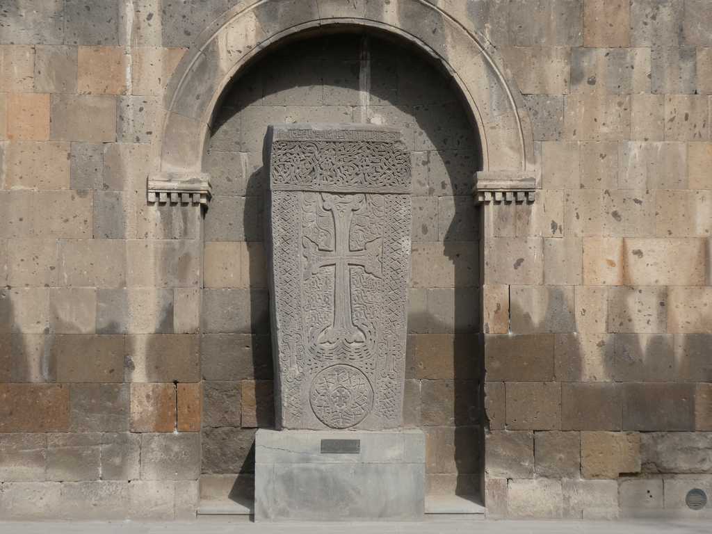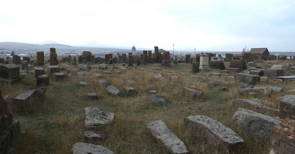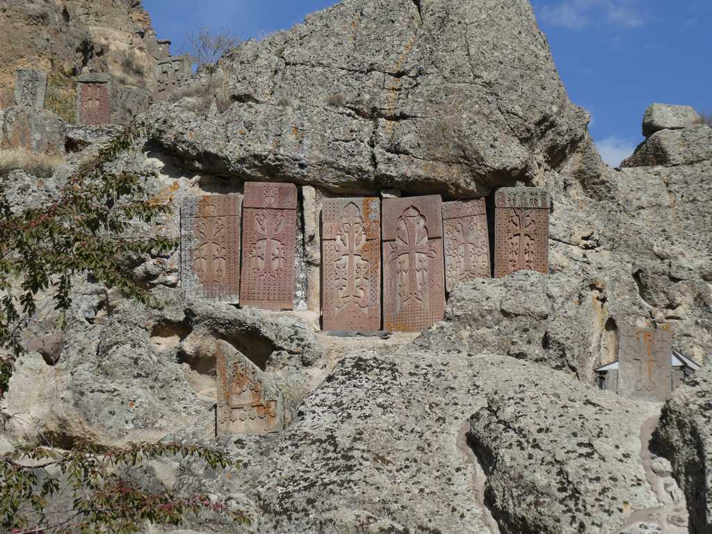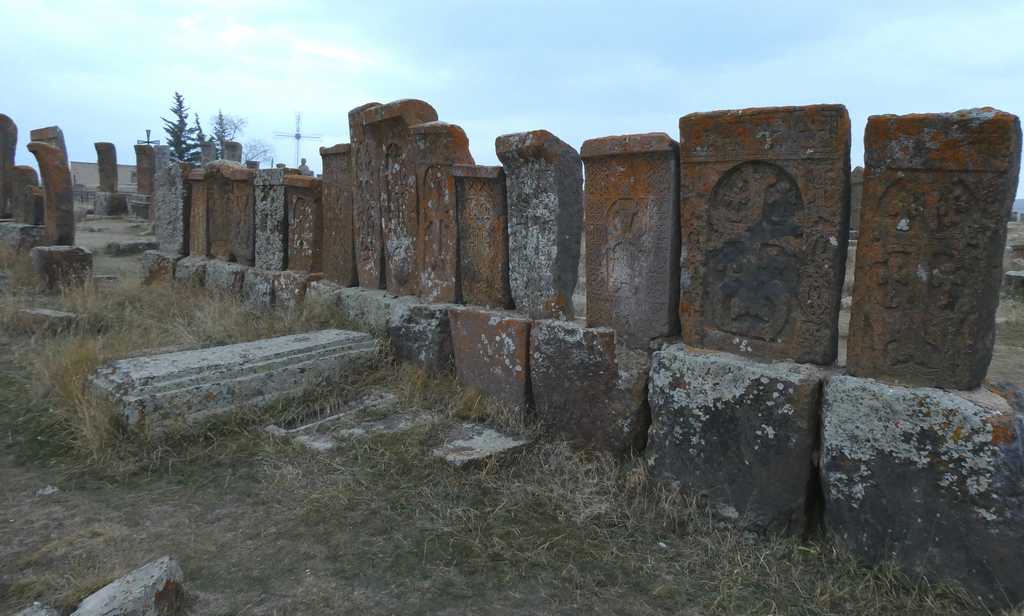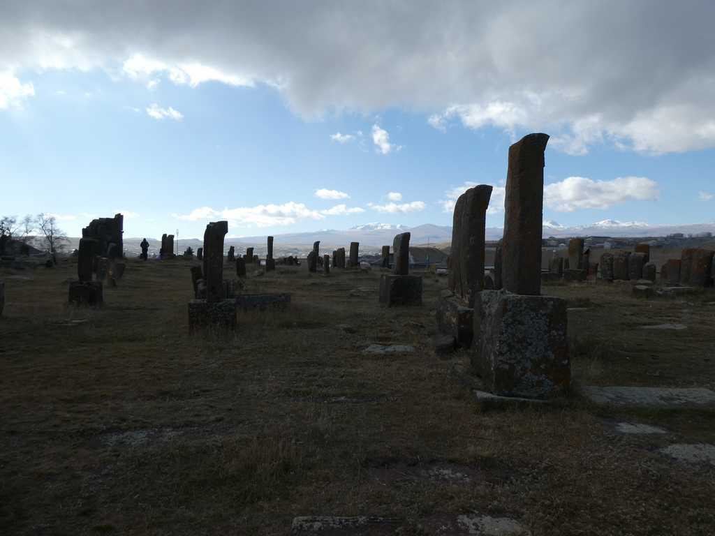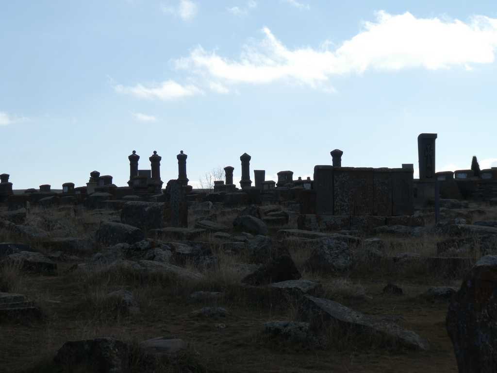 Auf einer riesigen Fläche sind hunderte alter Grabsteine, die sogenannten Kreuzsteine zu besichtigen. Manchmal stehen bis zu 13 Steine in einer Reihe. Wie uns erzählt wird, ist das eine gesamte Familie.
