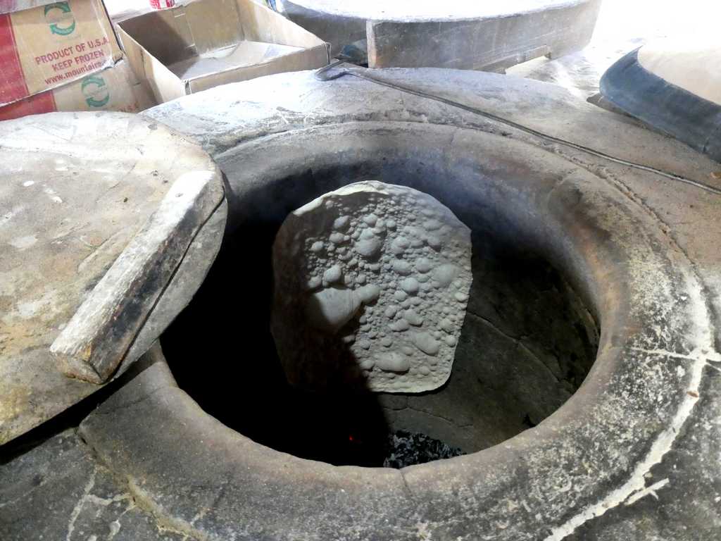 Sofort schlägt der Teig Blasen und nach wenigen Sekunden holt die Bäckerin diesen Fladen dann mit der Hand wieder heraus. Das muss ganz schnell gehen, ist es doch im Ofen extrem heiß.