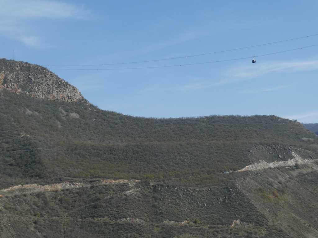 Wer diese kurvenreiche Strecke vermeiden und trotzdem zum Kloster will, der kann eine bequeme Gondel-Seilbahn über fast 6 km Länge nehmen. Nach den örtlichen Informationen ist es die zur Zeit längste Seilbahn der Welt. Man sieht die Gondel rechts oben im Bild. Sie wurde von österreichischen Unternehmen gebaut.