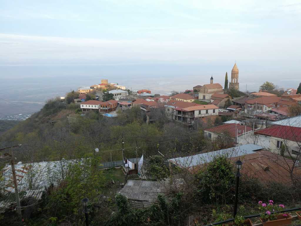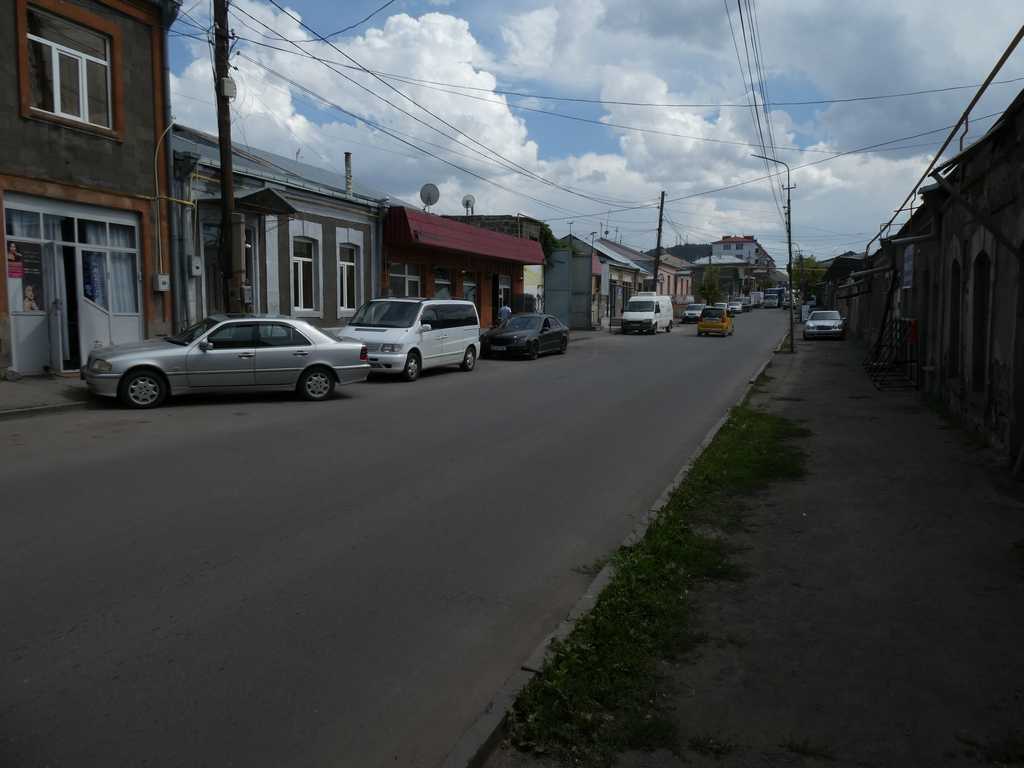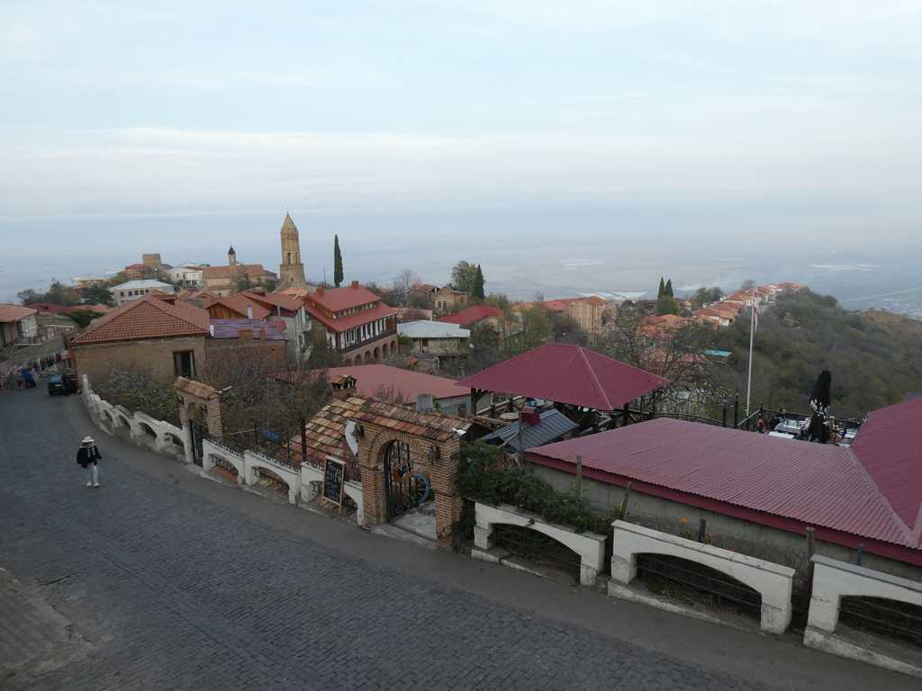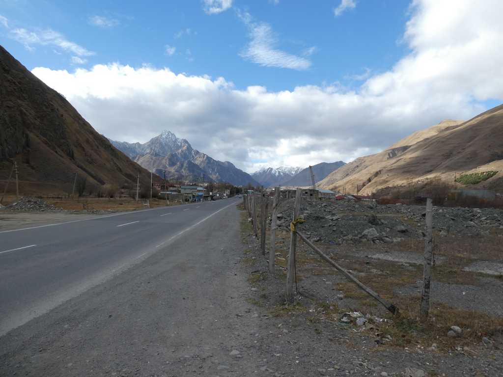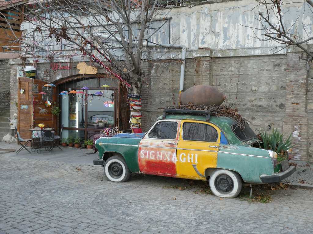Das Ortseingangsschild ist zweisprachig. Die georgische Schriftsprache ist doch so unbekannt für uns. Und wir sind froh über die lateinische Übersetzung, sonst könnten wir nichts lesen.