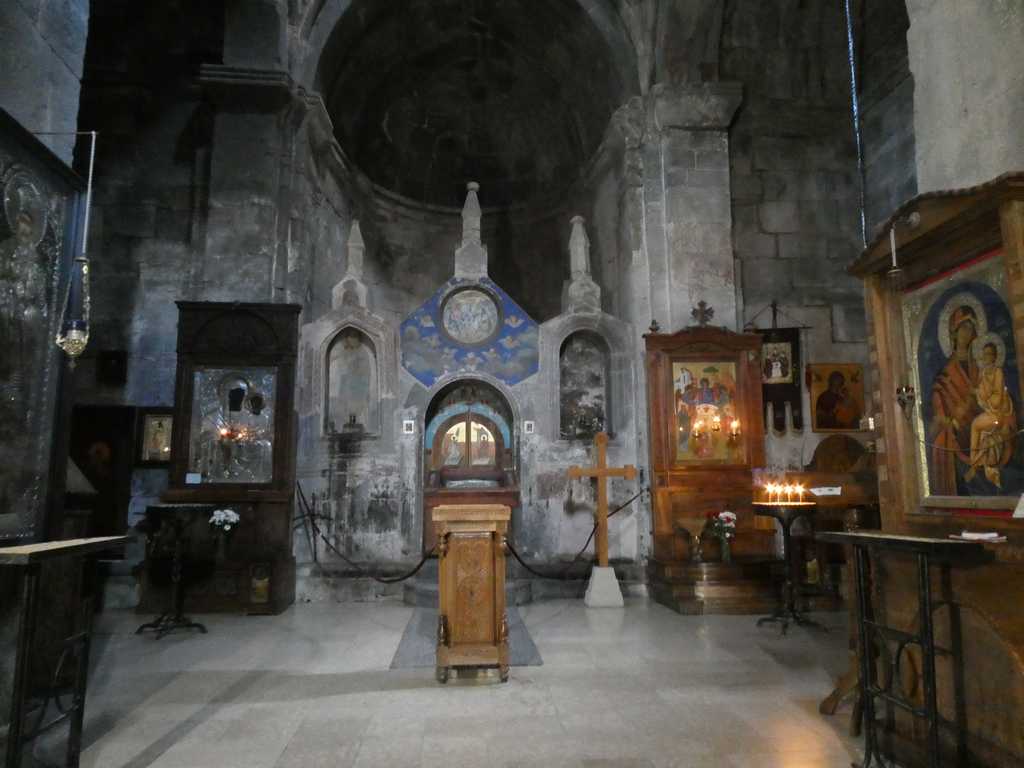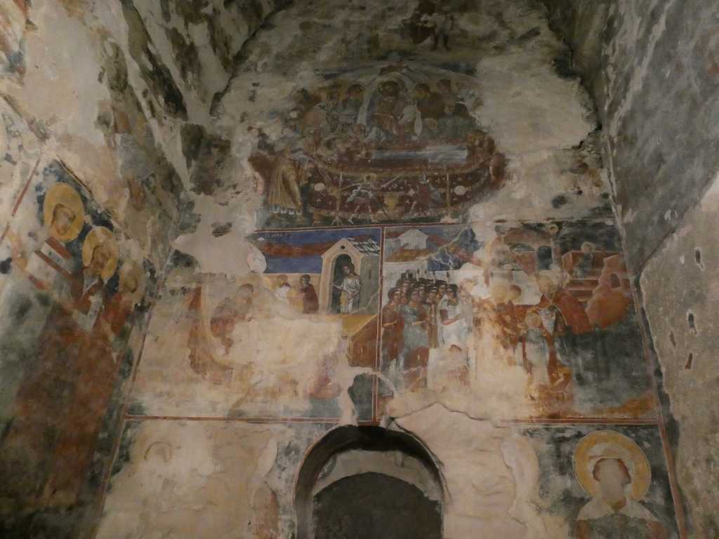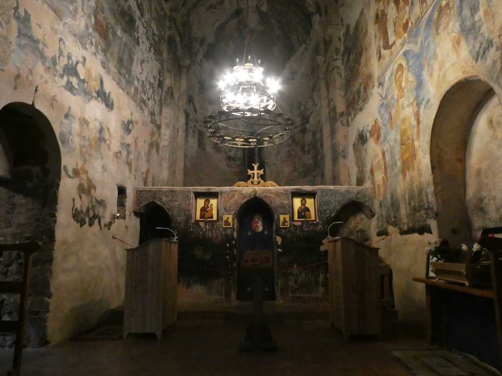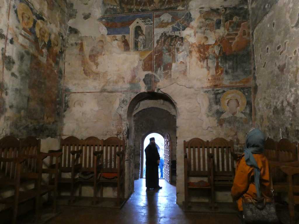 Im Inneren der Hauptkirche sind die alten Fresken noch relativ gut erhalten. In Georgien sehen wir solche Bemalung nach unserer Rundreise durch Armenien mit ihren im Inneren recht schmucklosen Kirchen zum ersten Mal wieder.