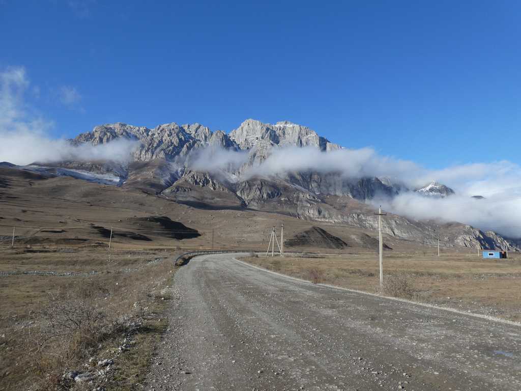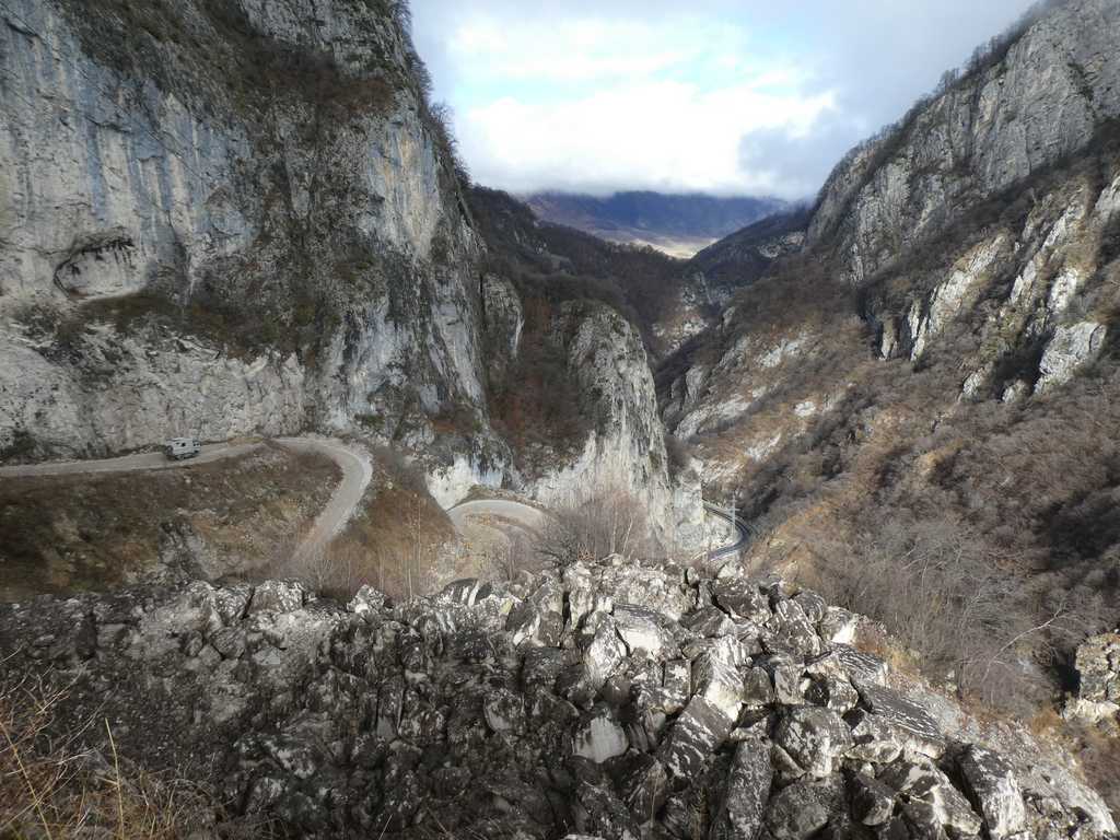 Wir sind auf dem Weg nach Dargavs. Die Straße ist zuerst gut asphaltiert. Doch dann wechselt der Belag in Schotter und der Weg wird kurvenreich. Nach ca. 1 Kilometer lassen wir Oskar in einer Parkbucht stehen und gehen zu Fuß weiter.