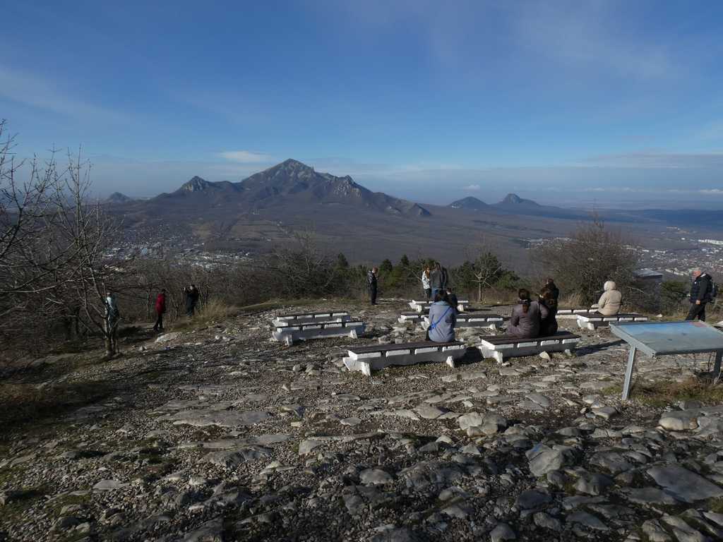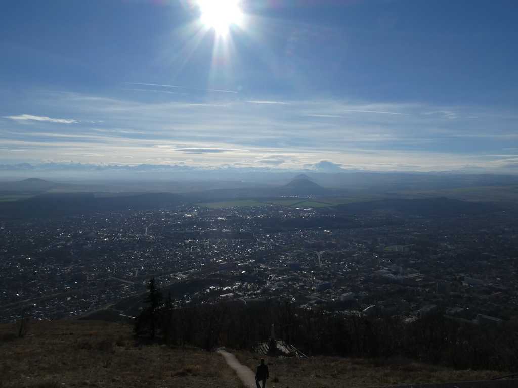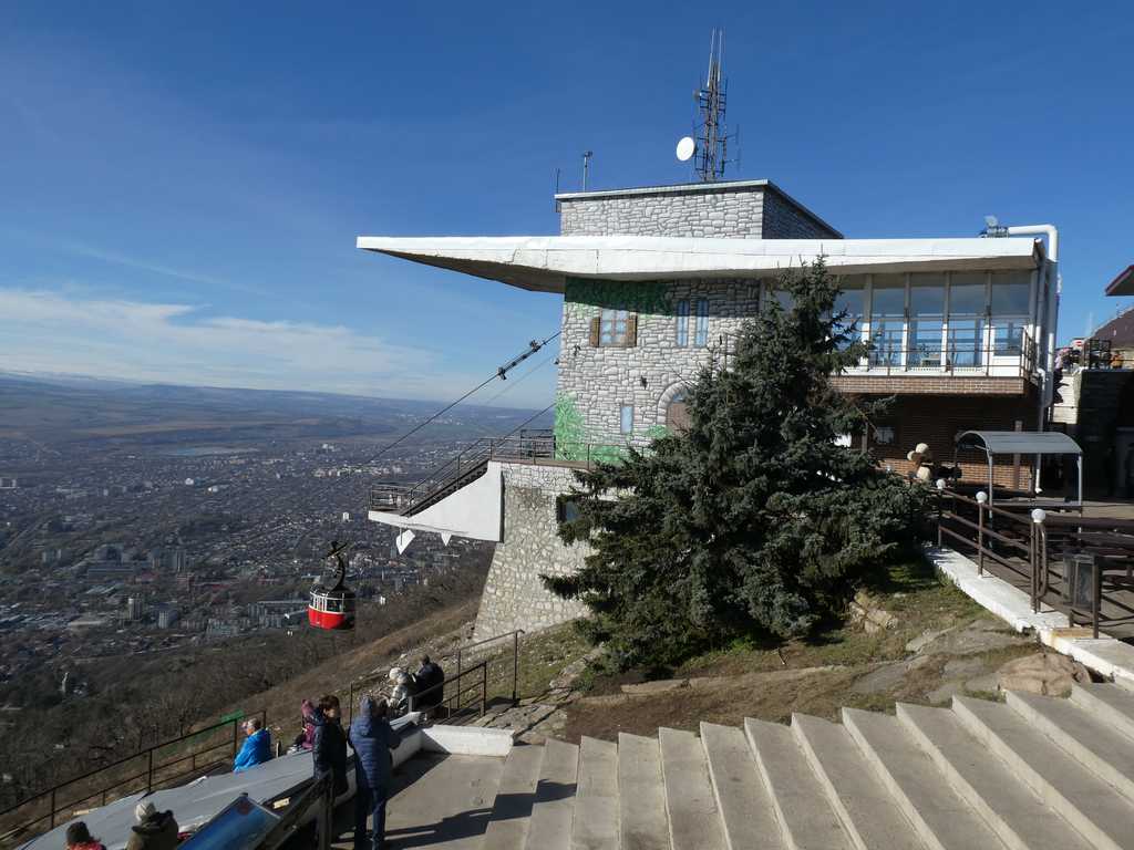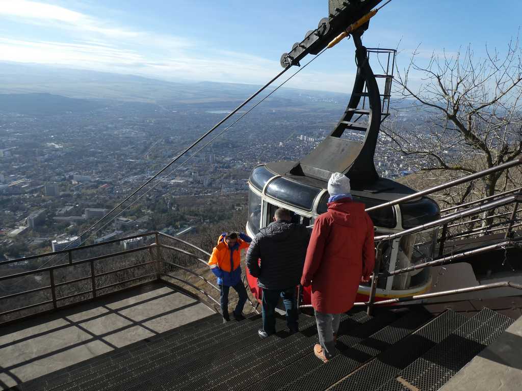 Mit der Seilbahn "erklimmen" wir den Hausberg. Oben angekommen eröffnet sich uns ein phantastischer Blick ins Umland bis hin zum Kaukasus. Auch der höchste Berg, der Elbrus, grüßt uns mit seiner Wolkenkappe.
