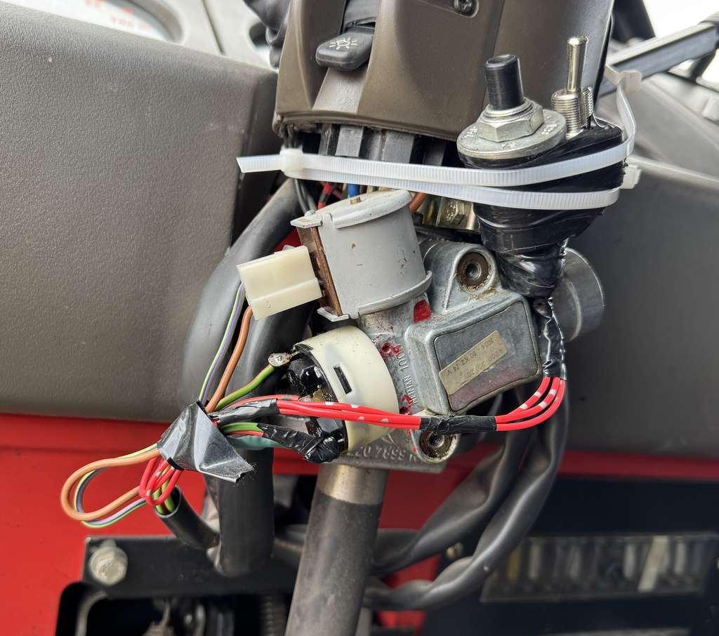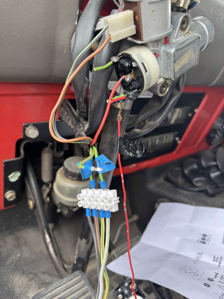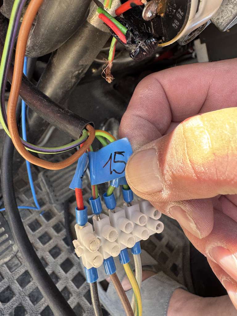 Zuerst gelang es mir das verbliebene Zünschloßteil an der Lenksäule mit einer Spitzzange so weit zu drehen, daß der Motor gestartet werden konnte. So gelangten wir in die angrenzende Stadt. Dort trafen wir nach einigem Herumfragen einen Autoelektriker, der uns mit einem Schalter und einem Taster die Elektrik wieder so hergestellt hatte, dass wir notdürftig weiterfahren konnten.