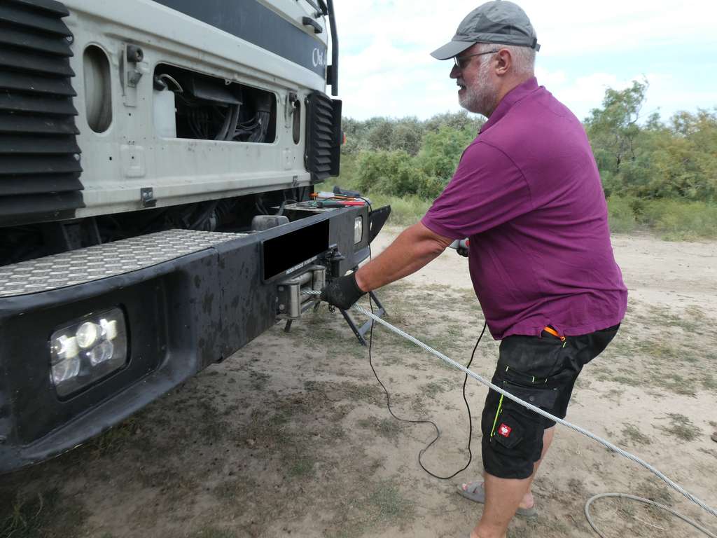Bei unserer Bergung aus dem Schlamm bei Ust-Ishim war unserer Seilwinde ausgefallen und wir konnten nicht einmal das ausgezogene Seil wieder aufwickeln. So sind wir mehr als drei Wochen mit dem Seil vor der Kühlerhaube angebunden durch die Gegend gefahren.