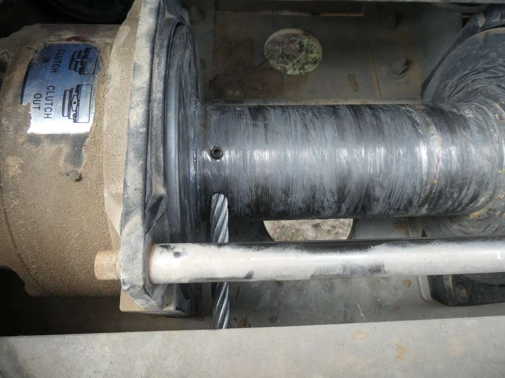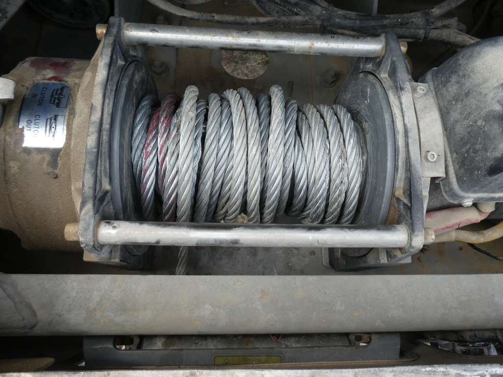 Nun wickelte ich noch das komplette Seil ab und stellte fest, dass das Ende ohne Widerstand von der Seiltrommel rutschte. Also habe ich das aufgespleißte Ende des Seils zuerst mit der Eisensäge zu kürzen versucht. Doch das Stahlseil ist aus einem hochfesten Stahl, sodaß mein Sägeblatt nach kurzem stumpf war. Nun war die Flex der Retter in der Not. Schließlich konnte ich das Ende in die vorgesehene Bohrung der Seiltrommel einführen und dann mit einer Sicherungsschraube sichern. Mit der Fernbedienung startete ich den Motor der Seilwinde und führte das Seil so, dass es sich gleichmäßig auf die Trommel wickelte.
