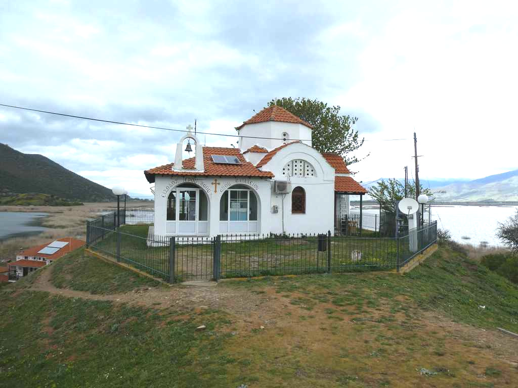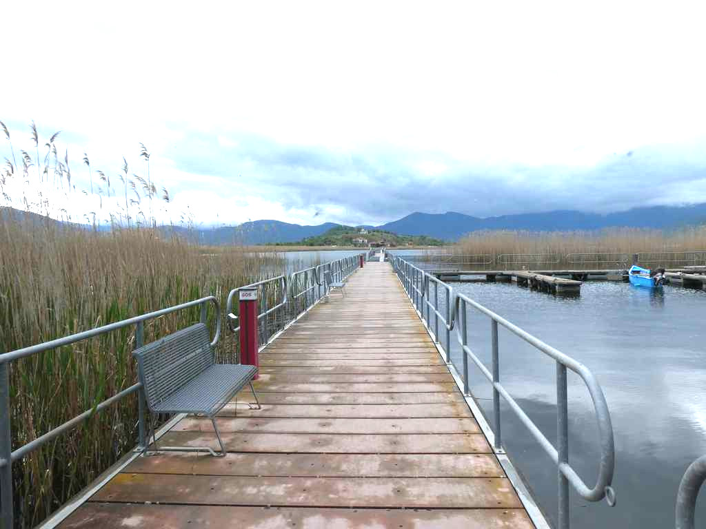 Ein ca. 500 m langer Steg auf Pontons führt direkt am Schilf vorbei auf die Insel Agios Achillios im kleinen Prespa-See. 21 Menschen leben heute noch auf der Insel dort von Landwirtschaft und Tourismus. Sogar ein kleines Hotel und ein nettes Restaurant kann man finden.