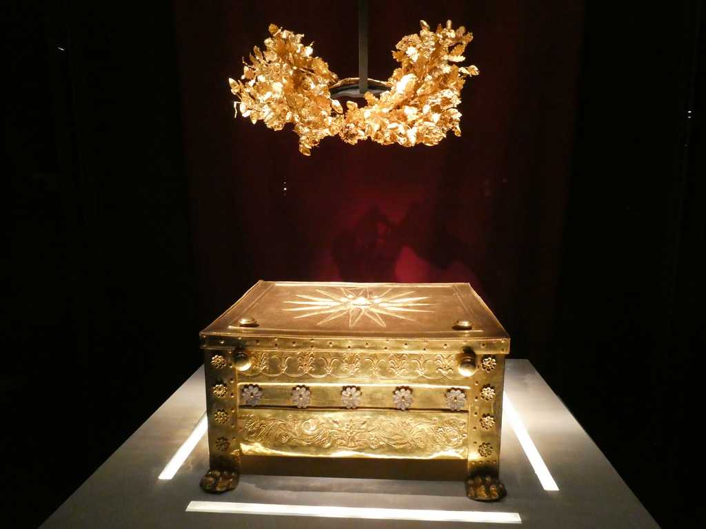 Wertvolle Grabbeigaben wurden gefunden, so die Königskrone und eine vergoldete Truhe mit den Gebeinen des Toten. Auch die filigranen Verzierungen einer Liege lassen uns staunend vor der künstlerischen Fertigkeit stehen.