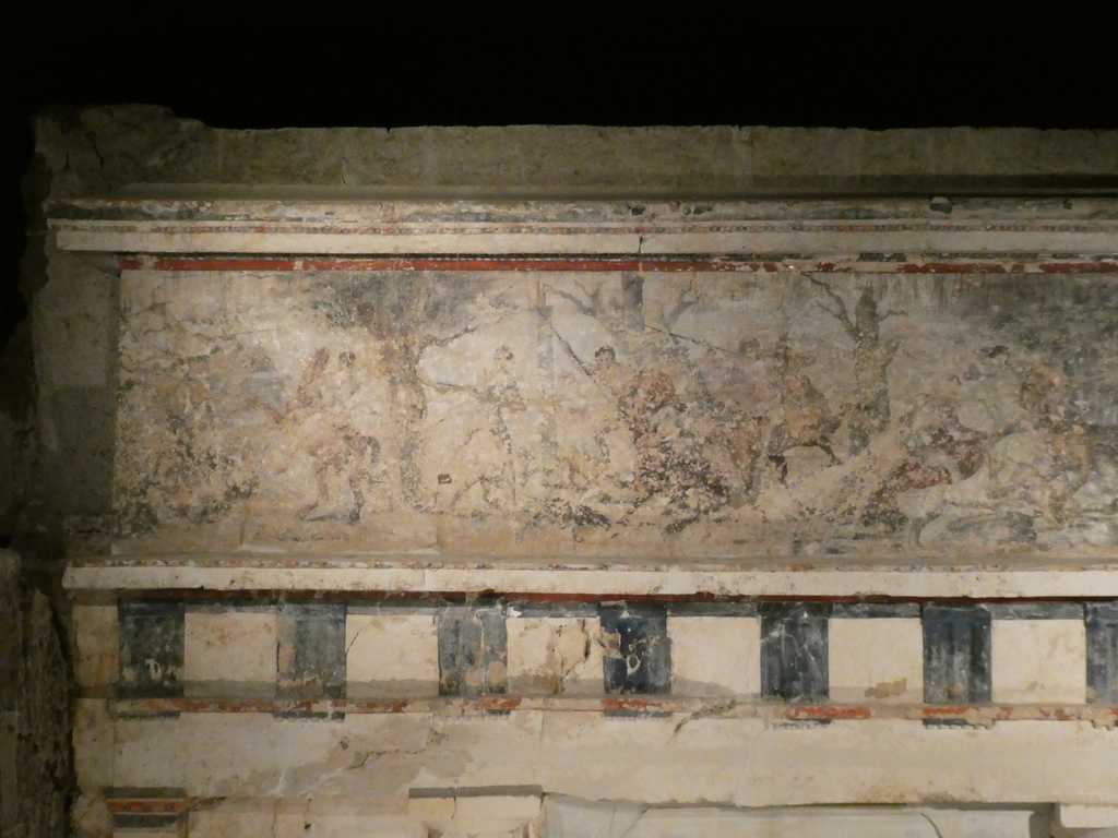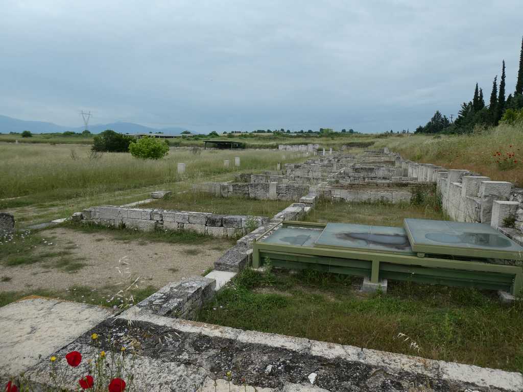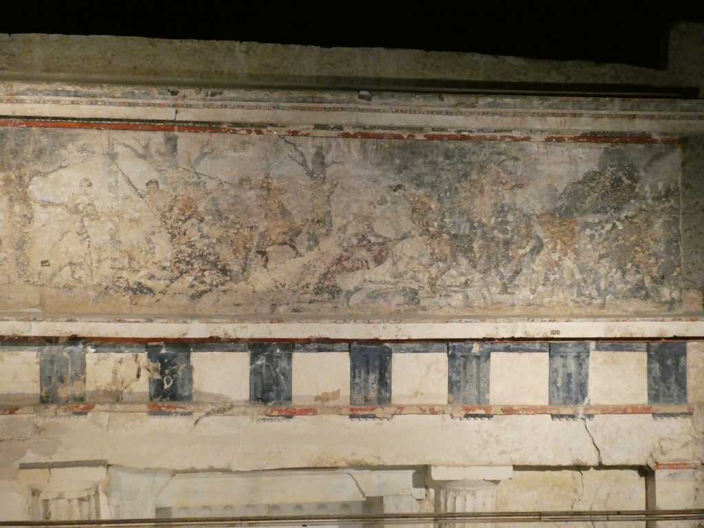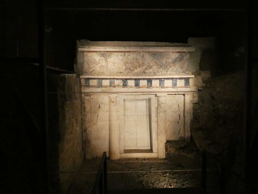 In Vergina besuchen wir das Museum der Grabstellen Philipp II., dem Vater Alexander des Großen. Das in den Grabhügel eingebaute Museum erlaubt auch einen Blick auf die Eingangsportale der einzelnen Grabkammern. Erstaunlich gut erhalten sind die Bemalungen im Türportal.