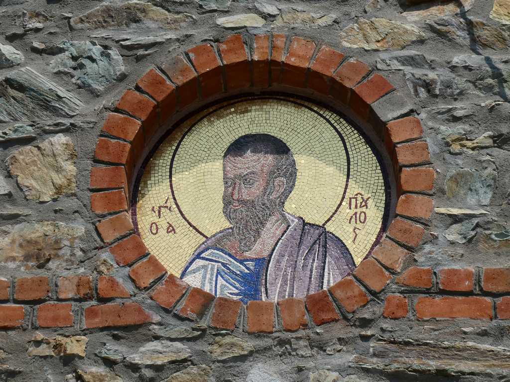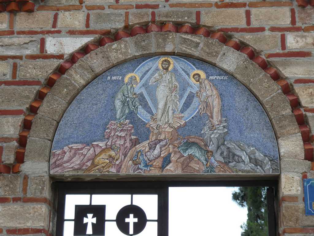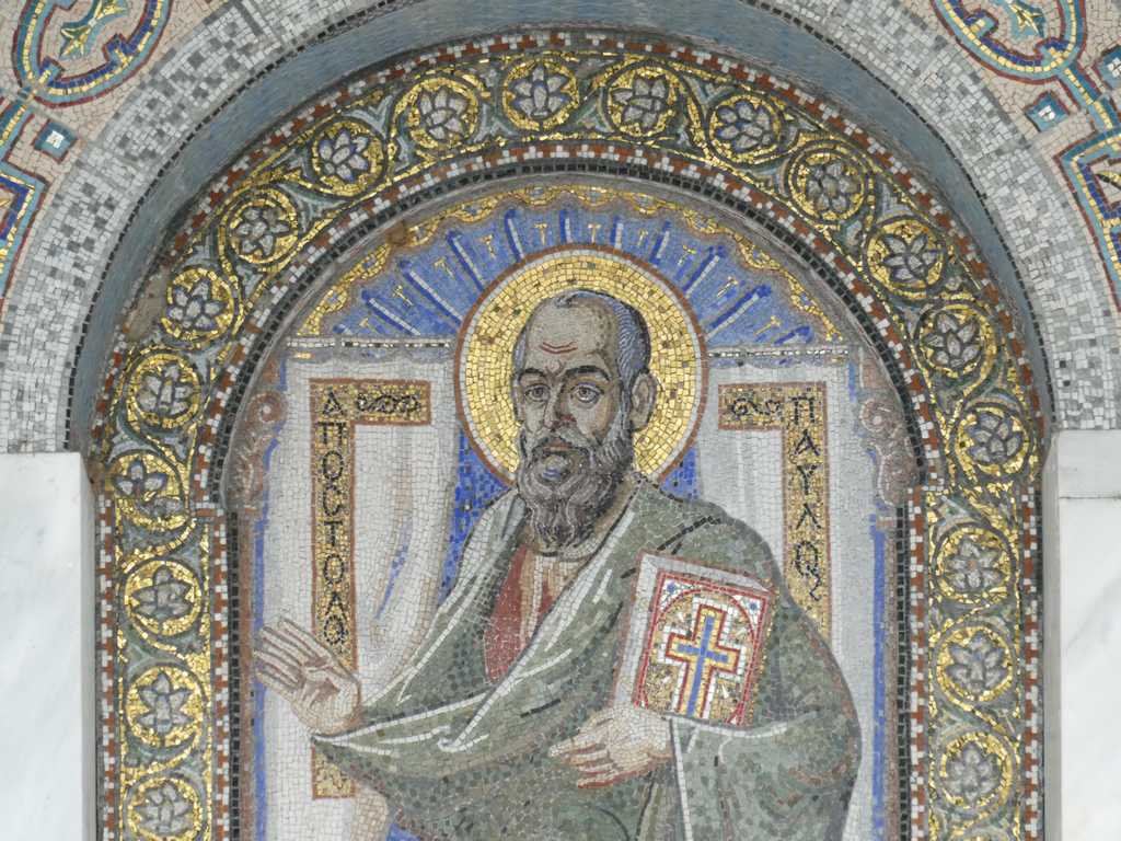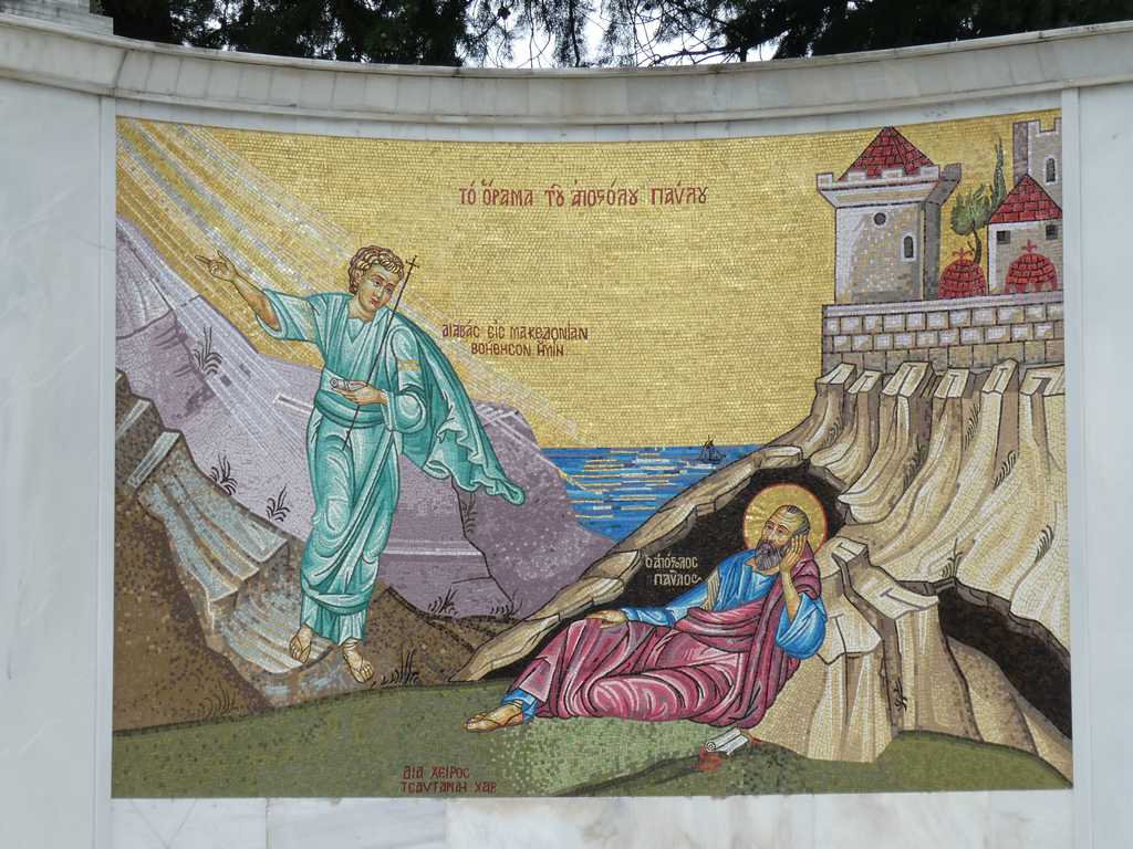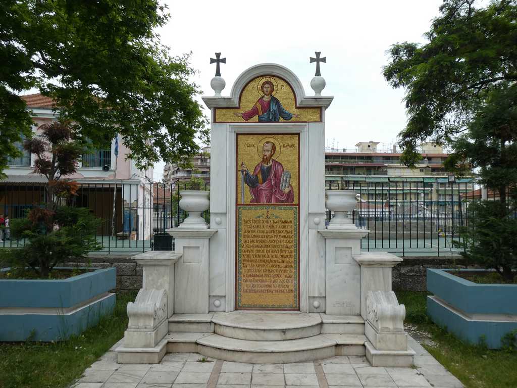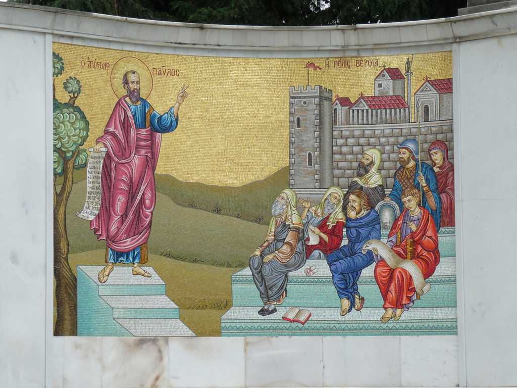In der Mitte der Gedenkstätte ist Paulus abgebildet. Direkt unter ihm finden wir noch einige alte Marmorstufen. Vielleicht sind das sogar Originale und Paulus hat auf diesen wirklich gestanden und gepredigt. Daneben sind zwei Szenen aus seinem Leben abgebildet: links das Damaskus-Erlebnis - Seine Bekehrung zum Christentum und rechts Paulus als Prediger in Beröa.