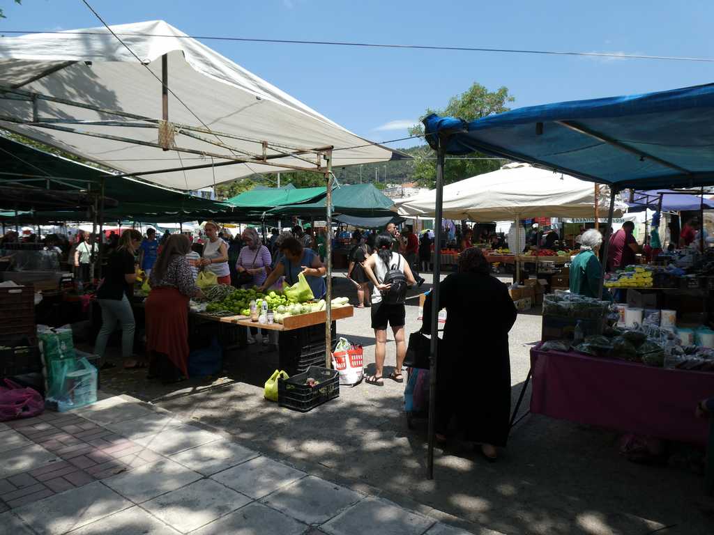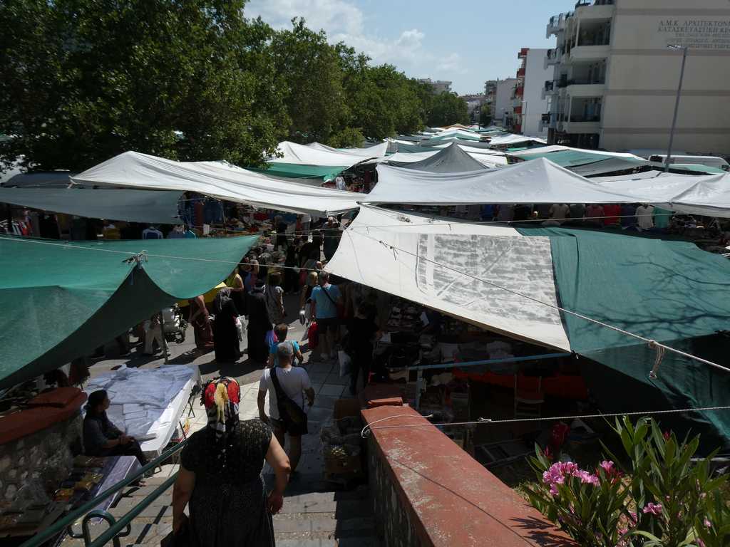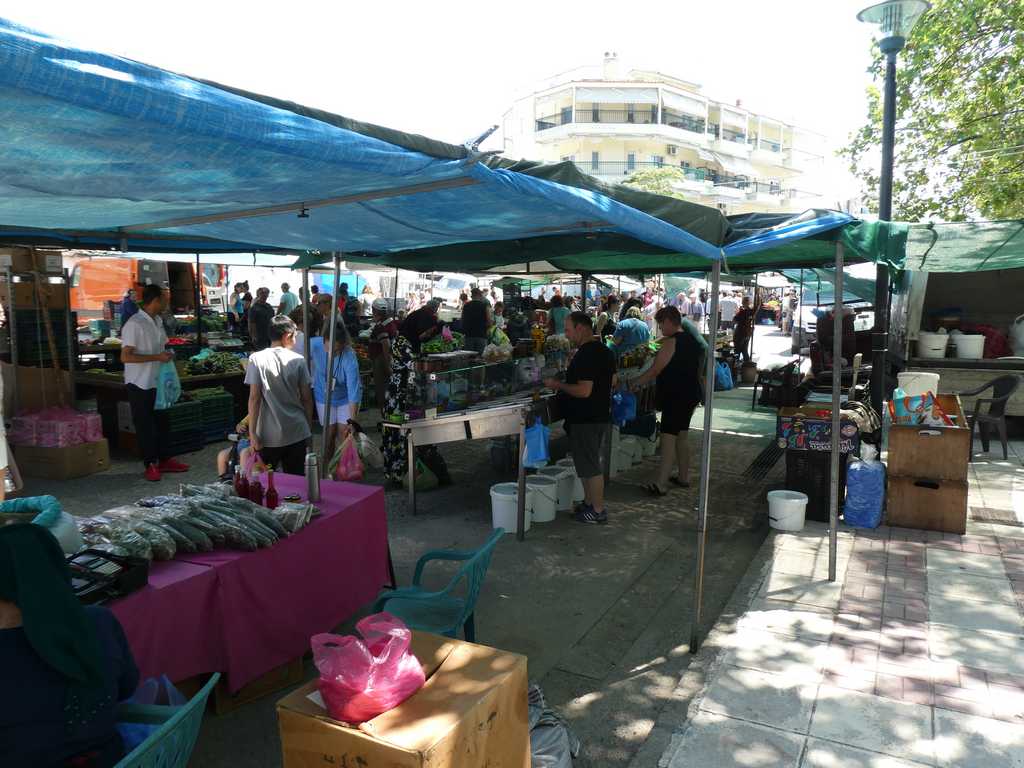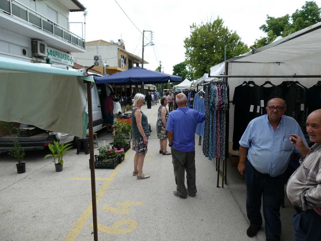 Es gibt einen Bereich für preiswerte Kleidung und einen für Obst und Gemüse. Dazwischen immer wieder ein Händler für Haushaltswaren oder Spielzeug, Honig, Süßigkeiten, Oliven und Olivenöl und natürlich den nicht fehlenden Tsipourou. Und auch ein Quasi-Baumarkt war mit vertreten. Ganz am Rand konnten wir einen Fischverkäufer entdecken. Wurst und Käse suchten wir jedoch vergeblich. Das war verwunderlich.