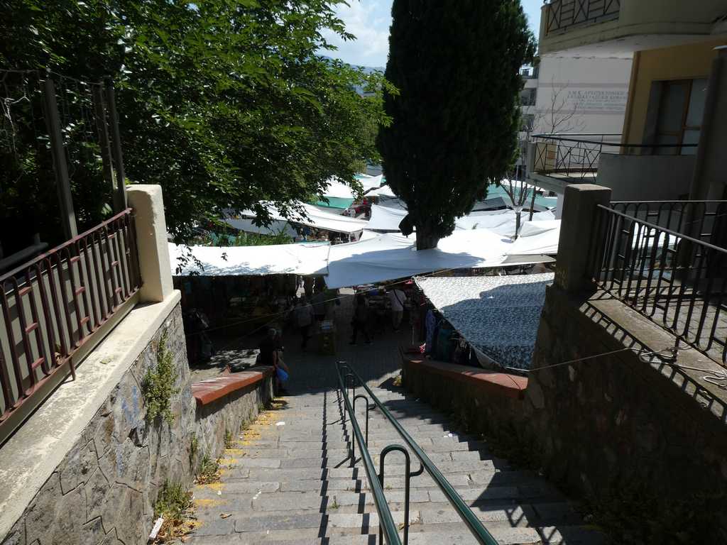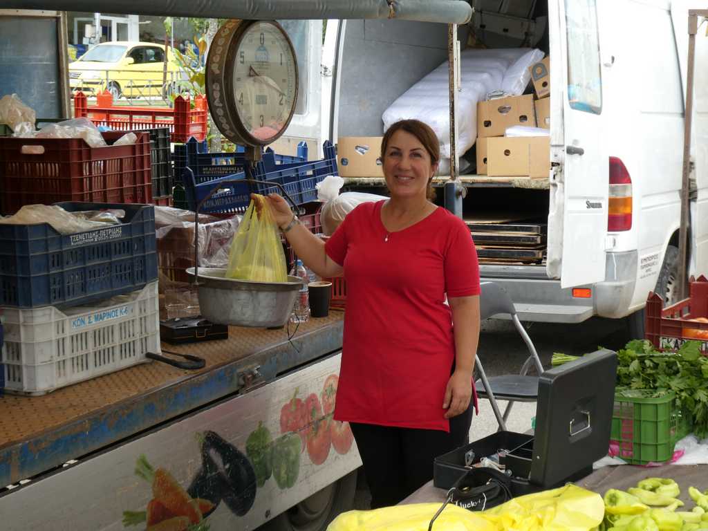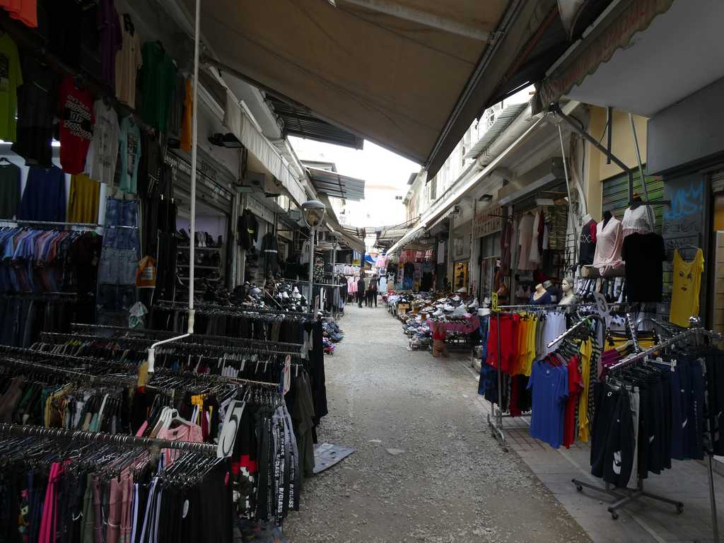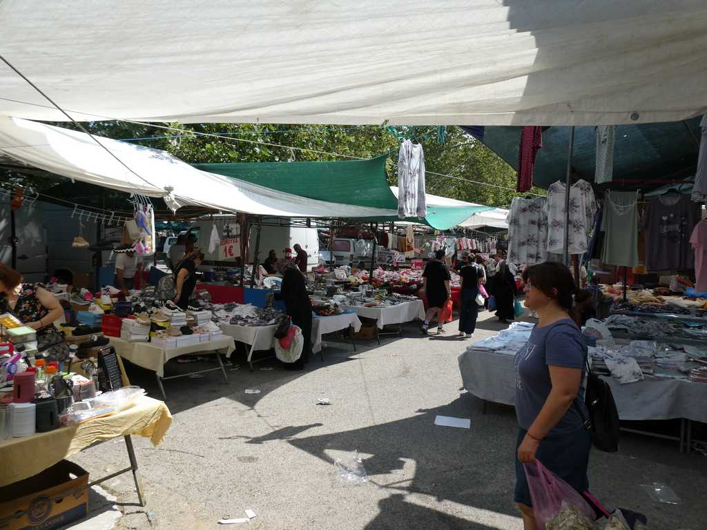 Es gibt einen Bereich für preiswerte Kleidung und einen für Obst und Gemüse. Dazwischen immer wieder ein Händler für Haushaltswaren oder Spielzeug, Honig, Süßigkeiten, Oliven und Olivenöl und natürlich den nicht fehlenden Tsipourou. Und auch ein Quasi-Baumarkt war mit vertreten. Ganz am Rand konnten wir einen Fischverkäufer entdecken. Wurst und Käse suchten wir jedoch vergeblich. Das war verwunderlich.