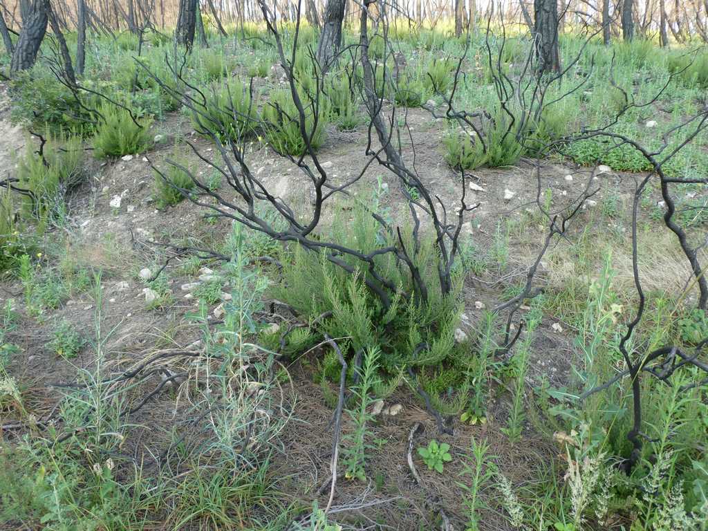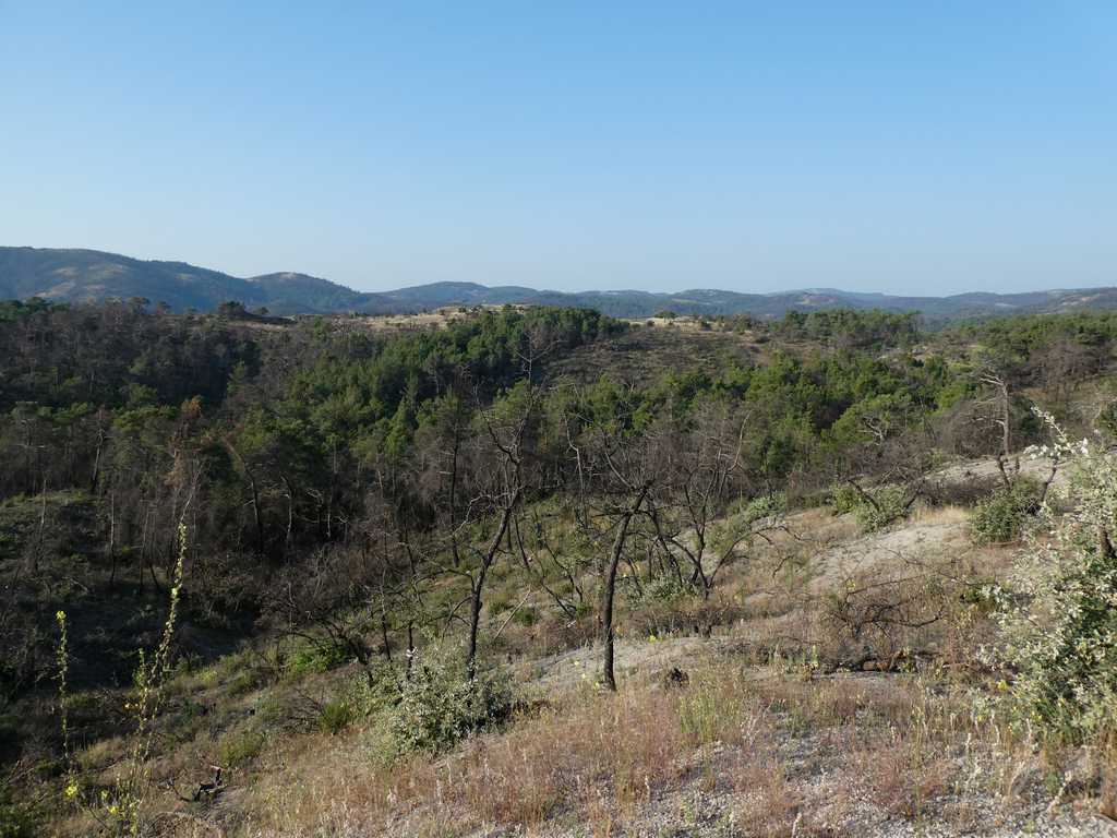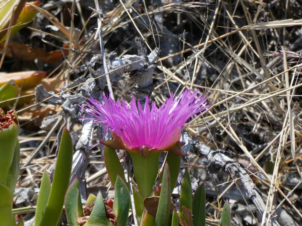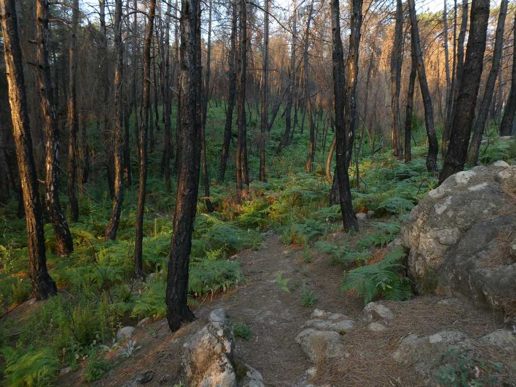 Wir starten bereits kurz nach 06:00 Uhr - heute soll ein heißer Tag werden. Der Weg ist ca. 4 km in eine Richtung lang und Schatten gibt es kaum. Vor einem Jahr (2022) hatte es hier einen großflächigen Waldbrand gegeben. Und der Wald ist extrem geschädigt. Aber an vielen Stellen kann man die Wunder der Natur wieder bewundern: Die Baumwipfel mancher Bäume sprießen wieder grün und aus den Wurzelstöcken mancher Büsche kommen neue Triebe. Das gibt wieder Hoffnung. Jedoch wird die Regeneration sich noch über viele Jahre hinziehen.