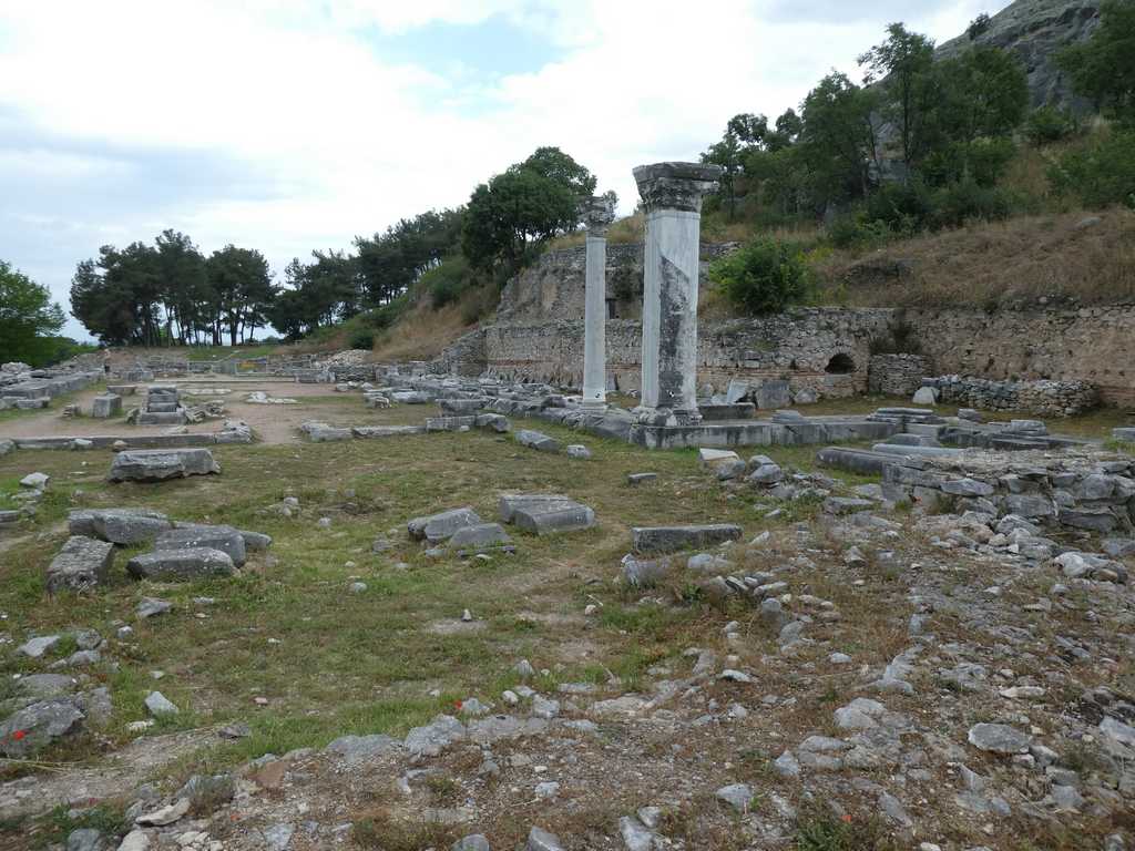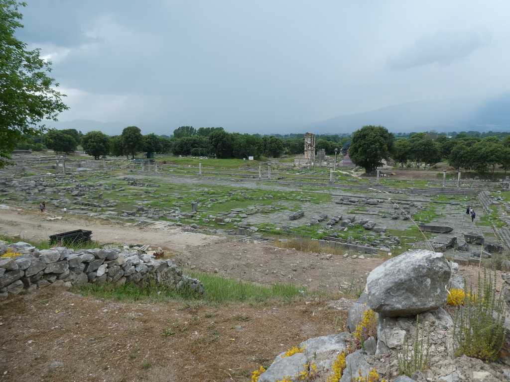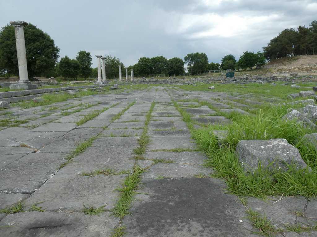 Die Abmessungen des zentralen Marktplatzes sind einfach überwältigend. Im Bild links oben kann man die Größe nur erahnen. Die beiden Säulenreihen begrenzen die nördliche und östliche Seite. Dazwischen liegt heute mit Gras und Büschen bewachsenes Land.