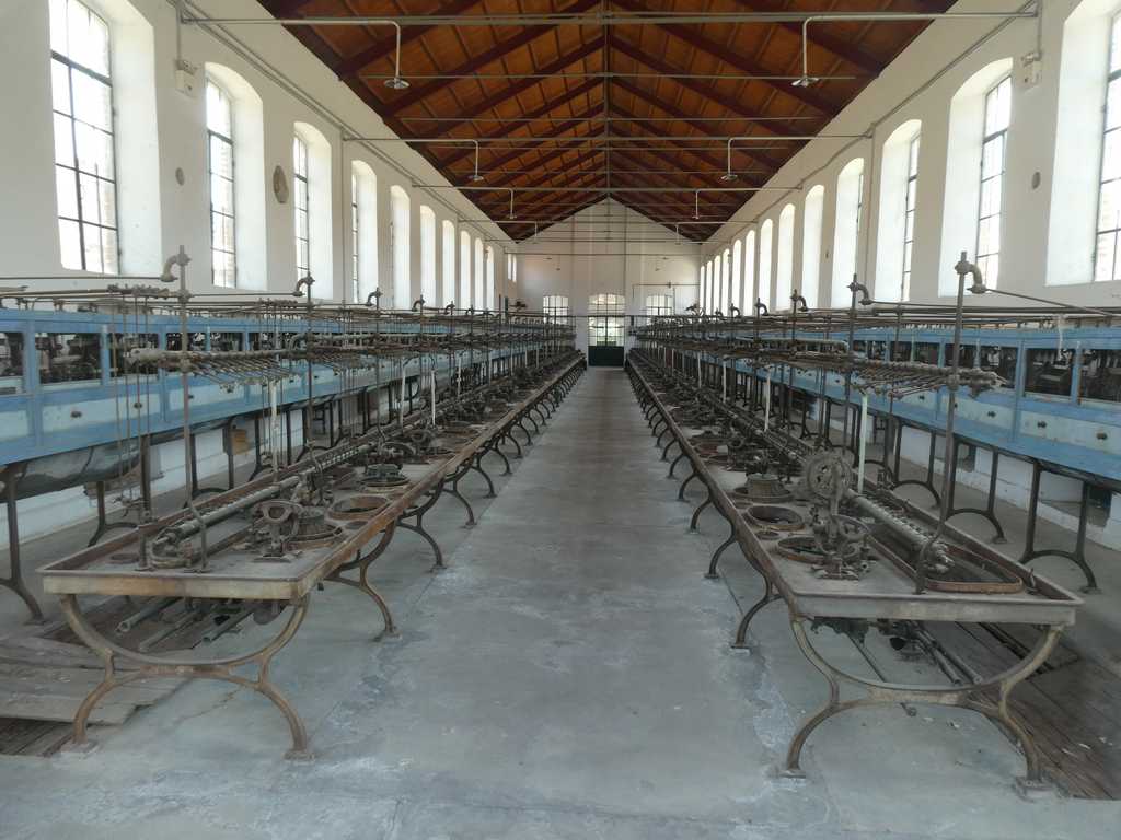 Am Ortsrand schauen wir uns zuerst die ehemals in Betrieb befindliche Seidenfabrik an. Zur Zeit wird diese als Museum umgestaltet. Ein Blick durch die Fenster des größten Gebäudes ist uns aber gestattet. Und so haben wir einen Blick in die Reihen von Arbeitsplätzen, an denen die Seide von den Kokons abgewickelt und auf eine Haspel aufgerollt wurde. Ein typischer Seidenfaden besteht aus Fäden von 8 - 10 Kokons, die gleichzeitig zu einem feinen, weichen Faden versponnen werden. Der Faden eines einzelnen Kokons hat eine Länge von ca. 2,5 km.