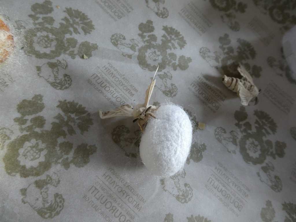 Auf dem unteren Bild kann man einen Kokon und zwei bereits ausgeschlüpfte Falter sehen. Diese waren sogar am Leben und bewegten ihre Flügel.