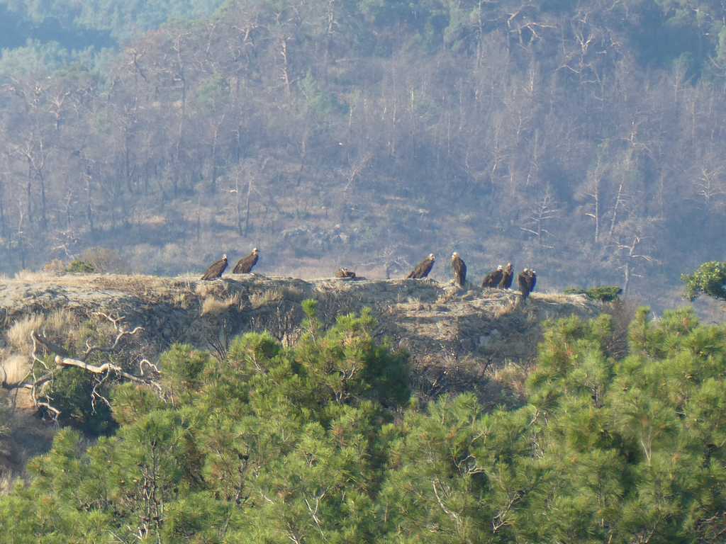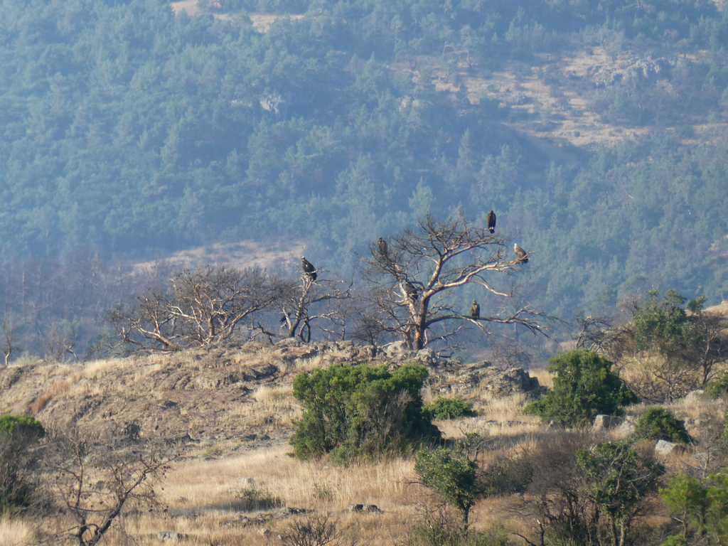 Da drüben auf der Anhöhe können wir mit dem Fernglas etwa 12 Geier und einen Adler beobachten. Eine Stunde bleiben wir hier, jedoch bewegen sich die Vögel kaum. Fütterung durch die Ranger war gestern und so bleibt uns dieses Schauspiel vorenthalten. Die Knochen auf dem Futterplatz sind schon alle abgenagt. Nur einige Raben und Dohlen suchen sich noch die Reste.
